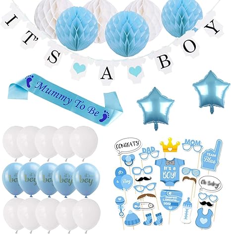 Danxian Babyparty Deko Junge Set Baby Shower Party Deko It S A Boy Girlande 6pcs Wabenballe Mummy To Be Scharpe Fotorequisiten Masken Konfetti Babyparty 10pcs Luftballons Amazon De Kuche Haushalt